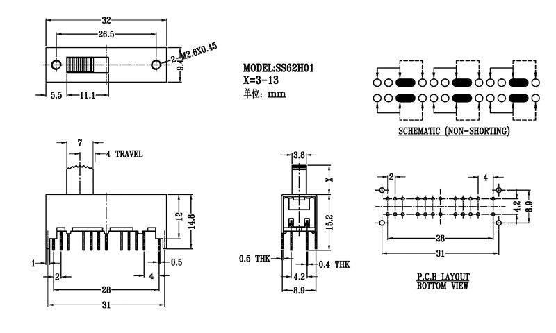 YX-SS-62H01是一款立式撥動開關-正撥撥動開關-2排6檔撥動開關廠家,結構牢固,多檔位,撥動力度均勻檔位感好,廣泛用于玩具電話機收音機家用電器等產品!